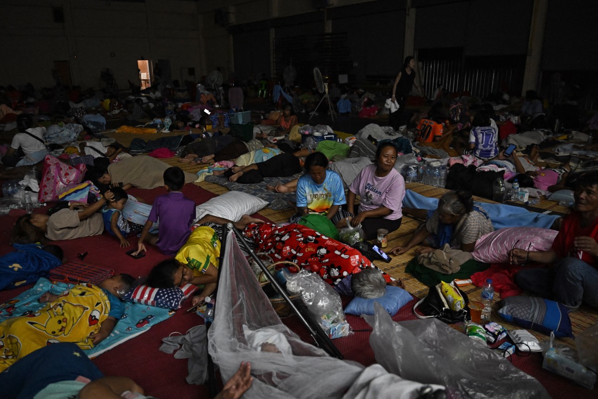 Evacuees take shelter in a gymnasium on the grounds of Surindra Rajabhat University, in the Thai border province of Surin on July 24, 2025. (Photo by Lillian SUWANRUMPHA / AFP)