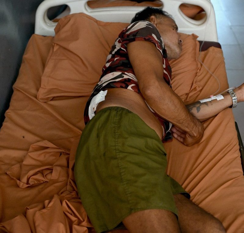 A Cambodian soldier injured in clashes with the Thai military rests on a bed in a hospital in Oddar Meanchey province on July 25, 2025. (Photo by TANG CHHIN Sothy / AFP)